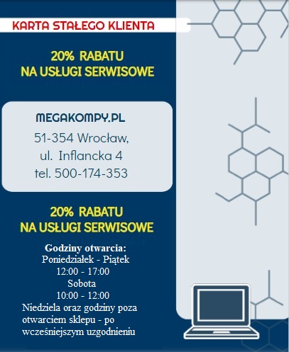 Dodatkowo dzięki KARCIE STAŁEGO KLIENTA będziesz otrzymywać na bieżąco informację o aktualnych akcjach promocyjnych oraz wydarzeniach organizowanych przez MEGAKOMPY.PL